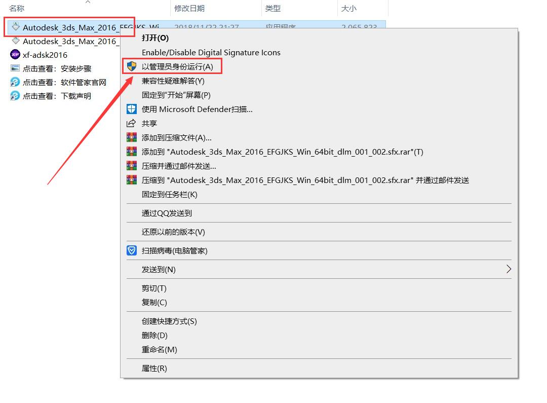 2.打開解壓后的文件夾,鼠標右擊【AAutodesk_3ds_Max_2016_EFGJKS_Win_64bit_dlm_001_002.sfx】選擇【以管理員身份運行】。