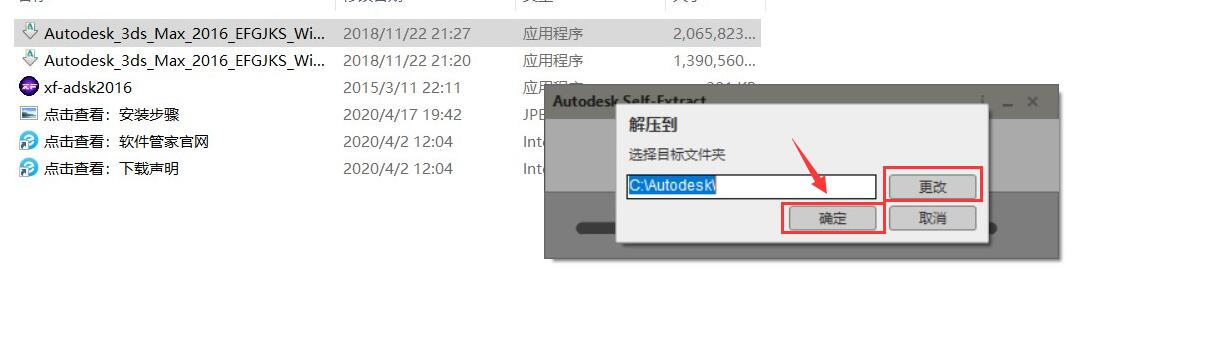 3.點擊【確定】(可點擊“更改”選擇目標文件夾的路徑,注意目標文件夾的路徑不能有中文,軟件安裝完成后可刪除此文件夾)。