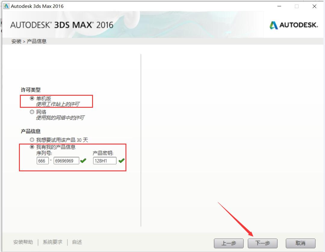 7.許可類型選擇【單機版】,輸入序列號【666-69696969】,輸入產品密鑰【128H1】,點擊【下一步】。