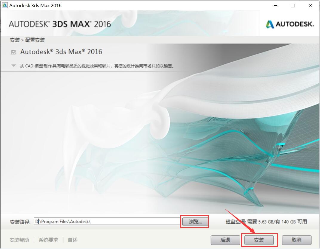 8.點擊【瀏覽】可更改安裝位置(建議不要安裝在C盤,可以在D盤或其它磁盤下新建一個“3dmax2016”文件夾。注:安裝路徑中不能有中文),點擊【安裝】。