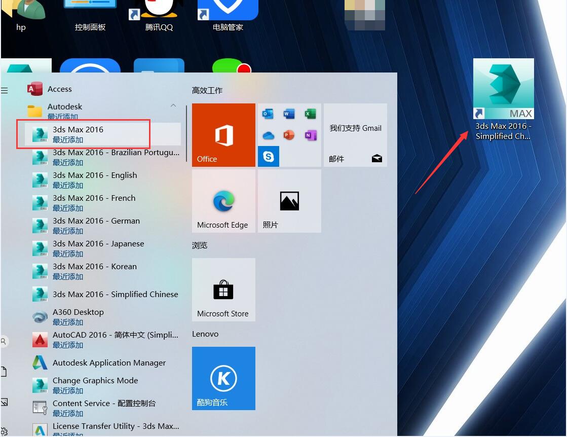 11.創建桌面啟動快捷方式:點擊桌面左下角【開始】圖標,點擊【所有應用】→找到并拖動【3ds Max 2016 - Simplified Chinese】圖標到電腦桌面。