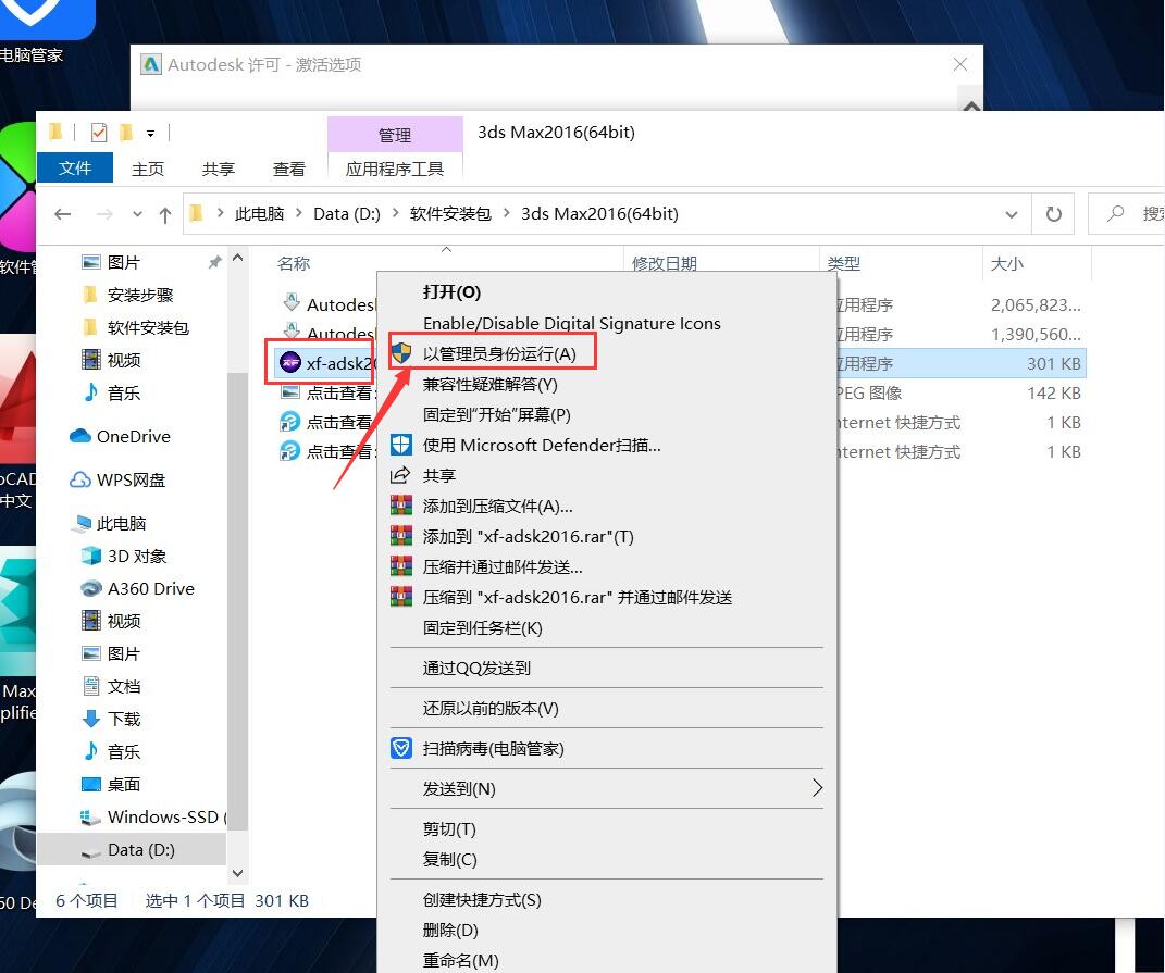 18.打開安裝包解壓后的【3ds Max2016(64bit)】文件夾,鼠標右擊【xf-adsk2016】選擇【以管理員身份運行】。
