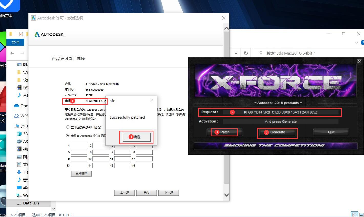 19.生成激活碼:①使用快捷鍵“Ctrl+C”復制【申請號】后的代碼;②使用快捷鍵“Ctrl+V”將代碼粘貼到【Request】后的框中;③點擊【Patch】;④點擊【確定】;⑤點擊【Generate】生成激活碼。