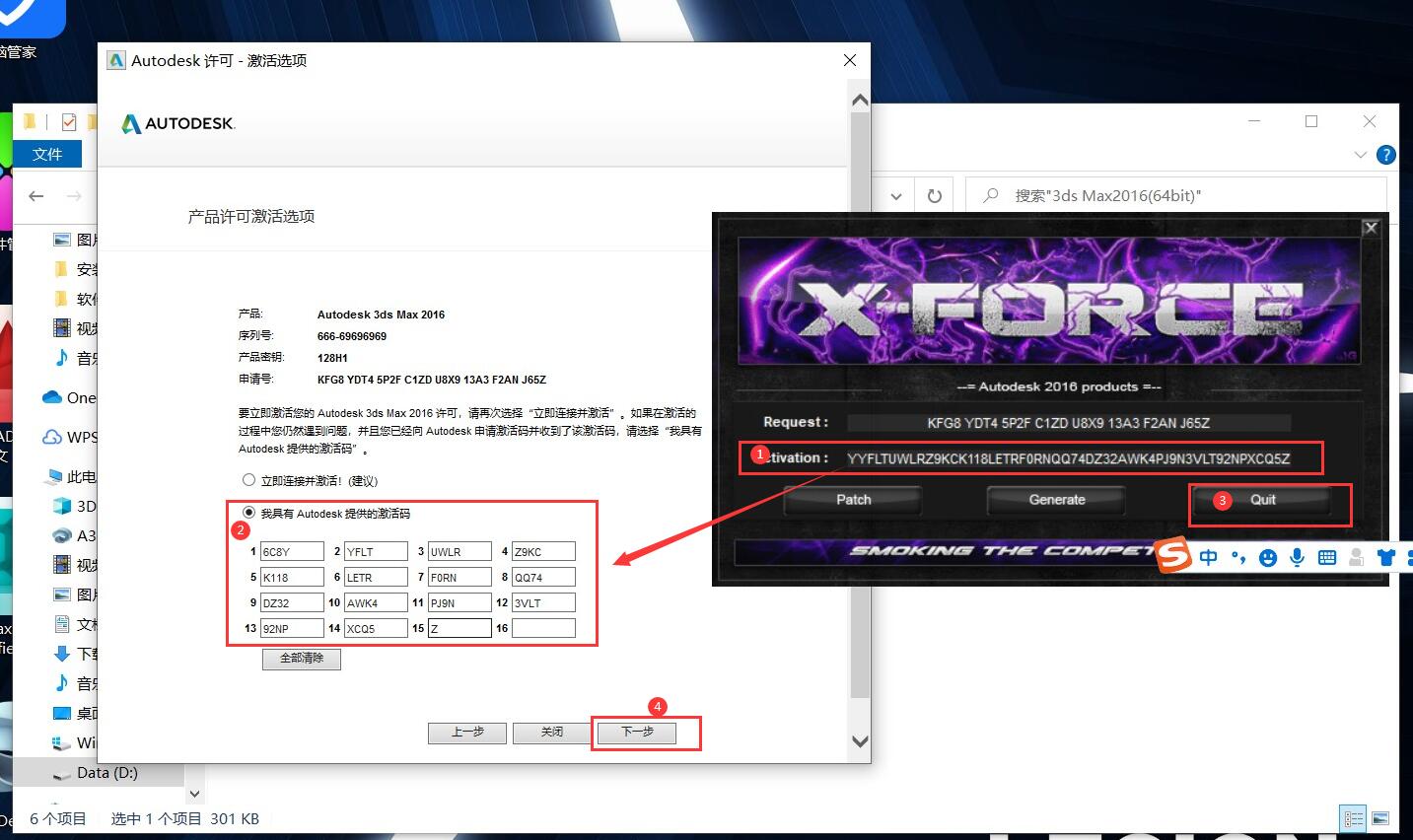 20.輸入激活碼:①使用快捷鍵“Ctrl+C”復制【Activation】后框中的激活碼;②使用快捷鍵“Ctrl+V”將激活碼粘貼到【激活碼輸入框】中;③點擊【Quit】;④點擊【下一步】。