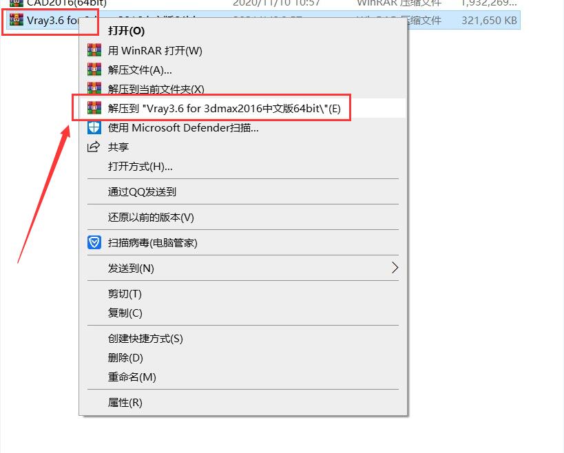 1.鼠標右擊【vray3.6_for_3dmax2016中文版64bit】壓縮包選擇【解壓到vray3.6_for_3dmax2016中文版64bit】。