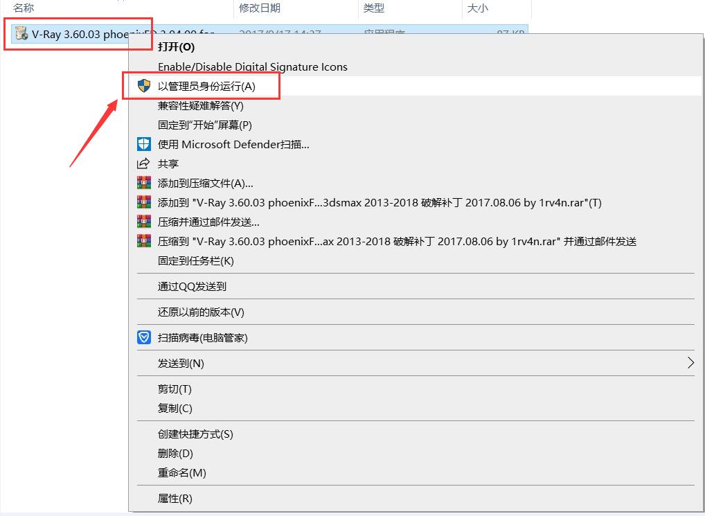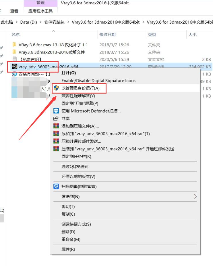 2.打開解壓后的文件夾,鼠標右擊【vray_adv_36003_max2016_x64】選擇【以管理員身份運行】。