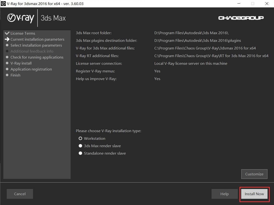 3.選擇vray3.6的安裝路徑,vray3.6會直接識別到3dmax2016的安裝路徑,直接點擊install now即可。