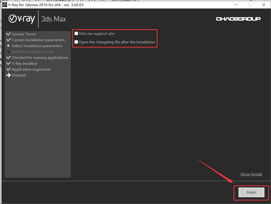 8.注冊vray3.6之后點擊finish。