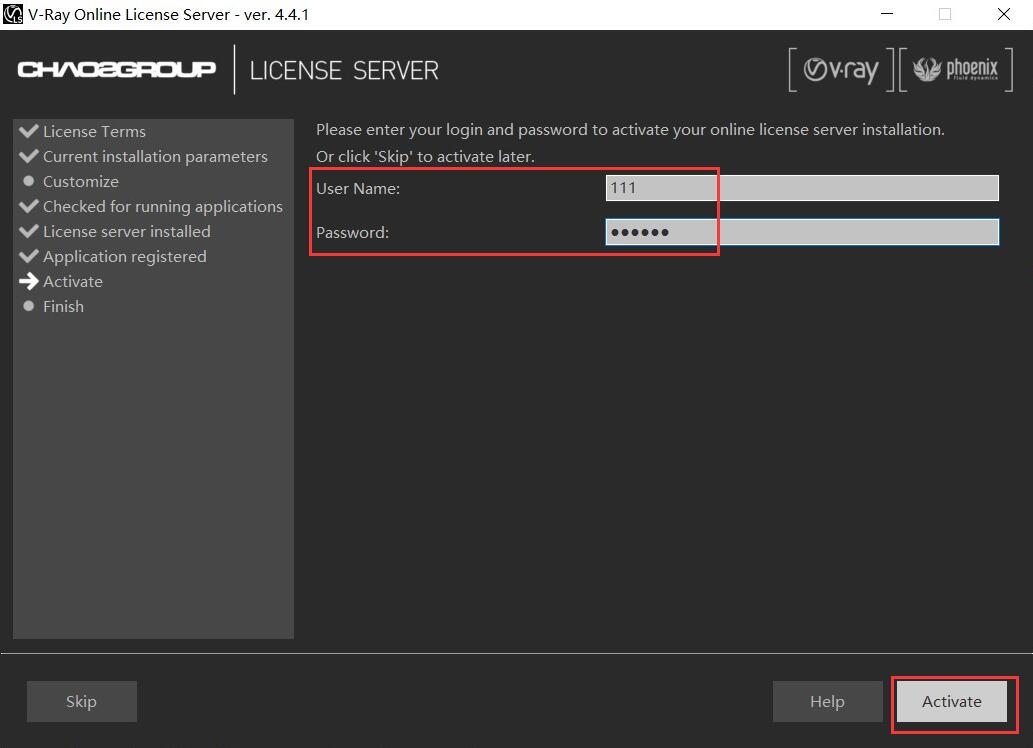 7.輸入vray3.6的用戶名,隨便輸,點擊activate。