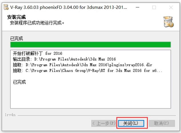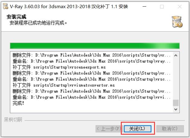 15.vray3.6破解補丁安裝完成之后點擊【關閉】。